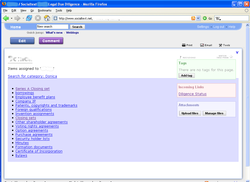 We are using our own (open source) wiki technology to track the progress of the Legal Due Diligence in our latest round of financing. (screenshots attached). The wiki runs as an extranet connecting our law firm (DLA Piper), Socialtext management, our VCs and our VC’s own law firm. It seems to be working really well – and was very simple to set up.