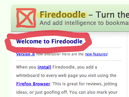 Those of you who use Firefox may want to take a look at a new add-on, Firedoodle. It provides a toolbar that lets you annotate any web page — that is, treat that page as though it were a whiteboard — and then save the annotations. You can draw in various colours of variable opacity; you can frame a portion of the page (see the linked thumbnail pics below); and you should be able to place markers at chosen points in the page and leave sticky notes on the page (though I’ve had trouble getting the former to work).