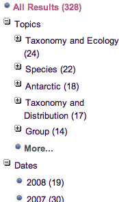 I ran a simple search for “taxonomy,” which threw up 79 initial results and an offer of 249 more, ranging from a taxonomy of bamboos to a taxonomy of XML document types. You can rank your results in a variety of ways and filter by database source.