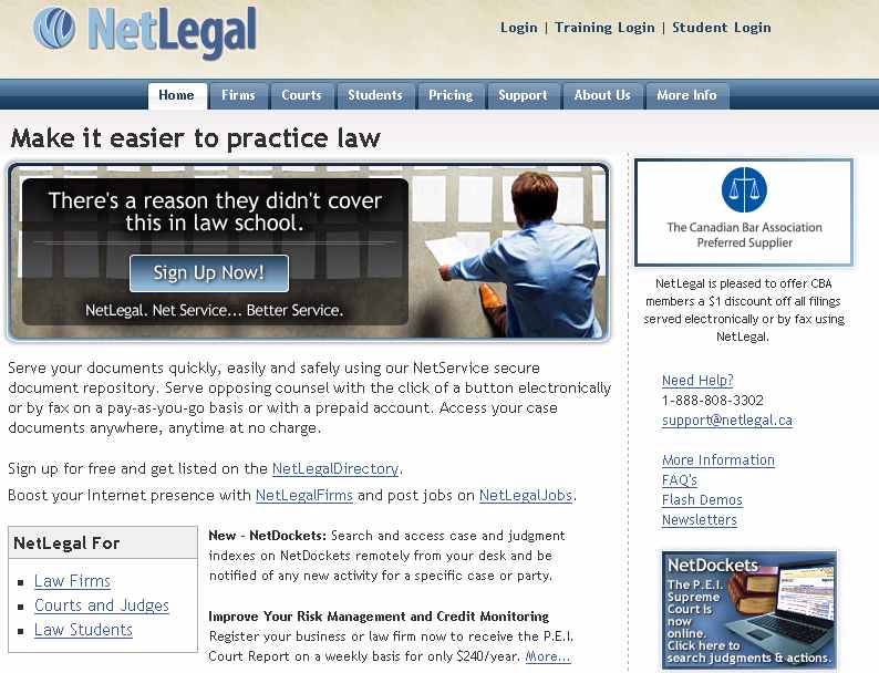 NetDockets – the premise of this is to monitor activity of court filings. Primarily available for the PEI civil courts, but expanding to the Federal Court in early 2009, practitioners will be able to subscribe to content of material that fits their chosen criteria, to view case information.