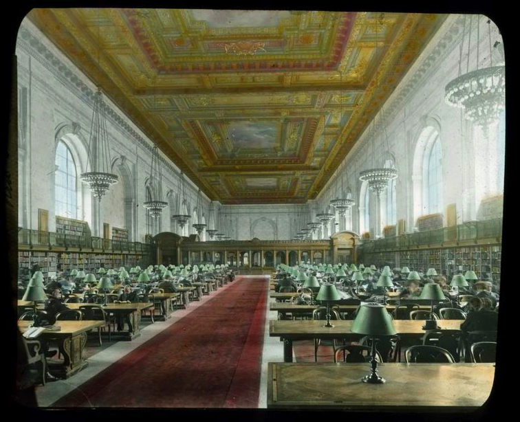To whet the appetite — of library lovers at least, is a glimpse of a photograph of the NYPL main reading room. Clicking on it will bring up the full photo.