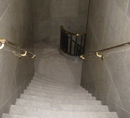 Lest you think that this… interest in what’s under foot is arcane, I should tell you that there are over 136,000 photographs in Flickr tagged with “staircase,” most of which it seems are spirals. For something completely different, however, have a look at a video of an eternal staircase — a paternoster — at Leicester University, and ask yourself what happens if you stay on at the top…