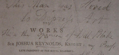 It reads in part: “This Man was Hired to Depress Art. This is the Opinion of Will Blake: my Proofs of this Opinion are given in the following Notes.” You can read the rest of what Blake had to say — his “proofs” if you like — again thanks to Google Books.