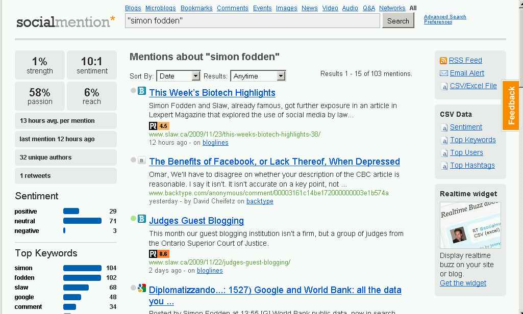 The sentiment is an interesting metric. I agree with Kendra that it is not entirely reliable, but interesting none the less. Some of the useful bits in the sidebar that socialmention.com displays are Sentiment,Top Keywords, Top Users, Top Hashtags, PostRank, and Sources – all with clickable links of course.