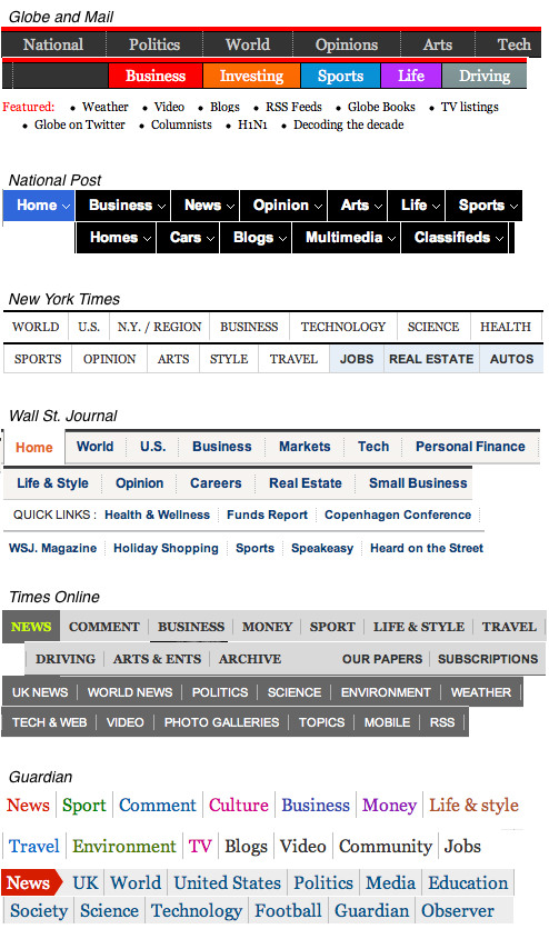 The home page menus for the big newspapers offer you a collection of stories on politics, the economy, sports, style, arts, science, cars, weather, and sometimes education and health. But never law. To look at how six highly respected English language newspapers (the Globe and Mail, the National Post, the New York Times, the Wall St. Journal, Times Online, the Guardian) map importance, click here to pop up a composite image.