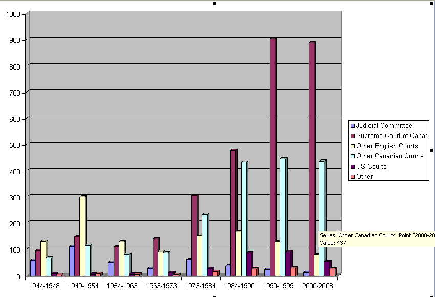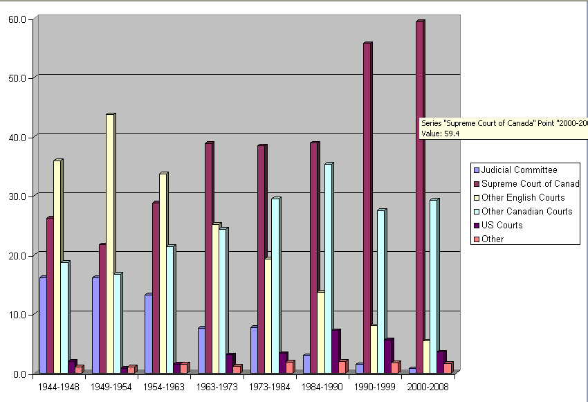 McCormick published a series of tables on citation patterns which showed by rough decade (actually tracked by the presiding Chief Justice) what sort of cases the SCC was citing to.
