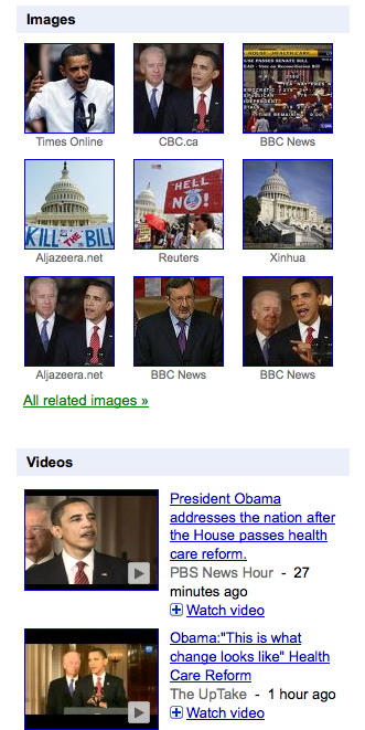 In catching up on the news about the progress of the US health care bill, I was interested in the mix of media that provided the news. Notably, the Google News page on US House passes healthcare reform shows an interesting mix of media (click on image for a larger view):