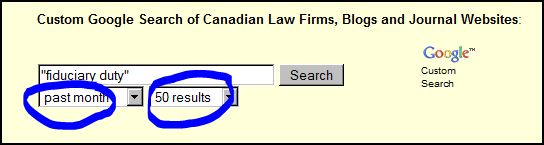 Finally, with the permission of Simon Fodden, I have borrowed his coding for the custom Google search on SLAW to my existing Custom Google search of Canadian law firm websites, blogs and journal sites so that my version also allows filtering by date (e.g., “the last month”, as shown in the screenshot below) and to allow up to 100 results per page (with the screenshot below showing “50 results” in the search on the phrase “fiduciary duty”):