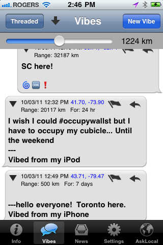 Who in this time of personal branding and global communication would use this self-effacing tool? Well, protesters, for one group. According to The Register “Vibe is now the instant messaging app of choice for the protesters at Manhattan’s #OccupyWallStreet.” The “cops are kettling” message can go out to your pals within 500 metres and be gone 15 minutes later. I’m not sure I’d want to bet the bippy on the promise of absolute anonymity, but it does seem unlikely that the local blue will be able to get a fix on the traffic for the next little while at least.
