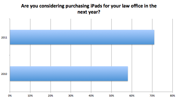 Unsurprisingly, the iPad saw a huge jump in usage. In the 2010 survey, 26% of respondents used an iPad in their law office; in the 2011 survey, that figure jumped to 56%. The remaining 44% of lawyers without an iPad apparently don’t plan on going without one for long: 71% of respondents were considering purchasing iPads for their law office in the next year: