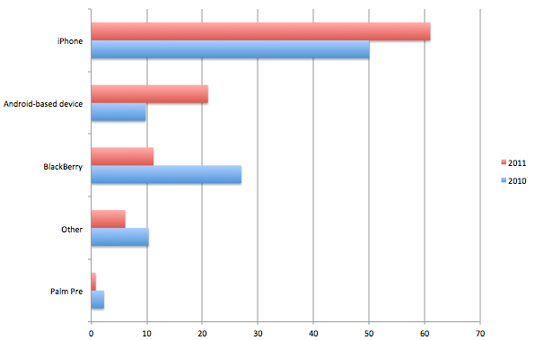 On the mobile front, iPhone and Android continued to surge in usage at the expense of BlackBerry and Palm: