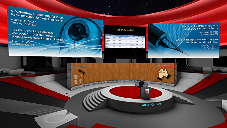 This topic is very timely across all Canadian jurisdictions. The Canadian Centre for Court Technology – Centre canadien de technologie judiciaire (“CCCT”) chose remote appearances as a topic for its White Paper in 2012 (published in January 2013 and available here), and this week, the CCCT is offering a series of sessions on the same topic in a virtual environment provided by Forum 2012 Sponsor Avaya Government Solution – here is a pic of what it looks like (yes that’s my avatar in the picture):
