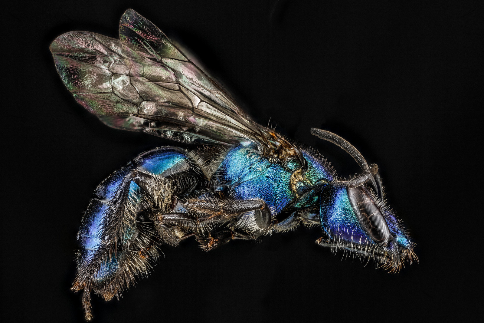 So what about focusing in tightly? This is where the blue bee comes in. Sam Droege takes photos of bees, really really tight closeups of bees. He uses a special technique that puts all regions of the animal into focus, and the results are quite wonderful: