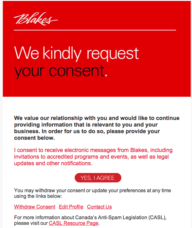 You may already have been peppered with these—I’m not the person most tightly in the loop—but I thought you’d like to see what one of the big firms is doing by way of compliance with Canada’s Anti-Spam legislation. This arrived by email, allowing for an email reply. And there’s also a companion version on the Blakes website: