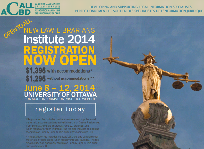 Registration is now open for the 2014 edition of the New Law Librarians’ Institute. This is an intensive, week-long program aimed at developing skills in the key competencies of law librarianship developed and presented by the Canadian Association of Law Libraries.