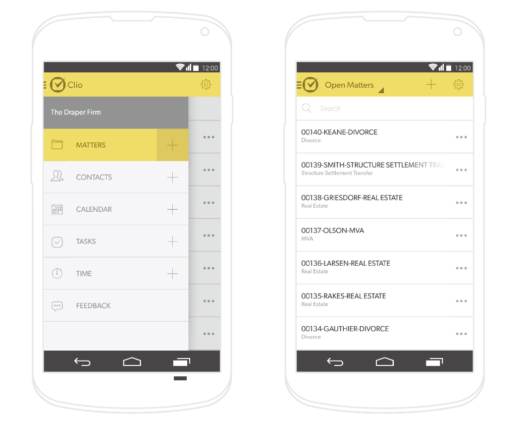 As one would expect, Clio’s new Android app takes its visual lead from the iOS app released last year. It also offers similar functionality to the iOS app, allowing lawyers to work remotely with documents, update their contact list, track time, and so forth. The announcement here, to be blunt, is that Clio now have an App product for Android — an access point not replicated by many competitors. Product shot below: